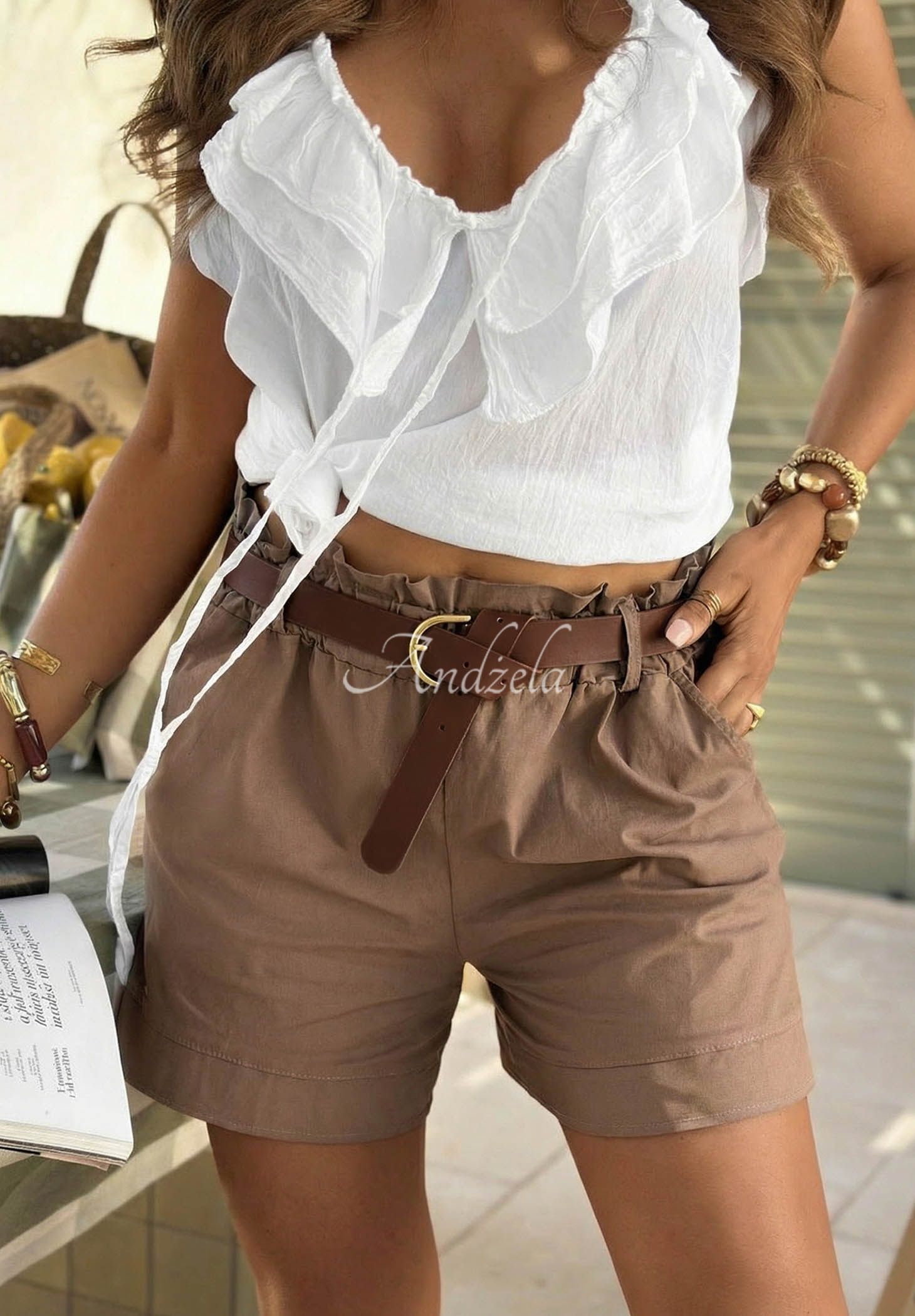 Šortky z elastického bavlněného materiálu. Model s pružnou gumou v pase a funkčními kapsami vpředu. Součástí soupravy je pásek z imitace kůže se zlatou sponou.