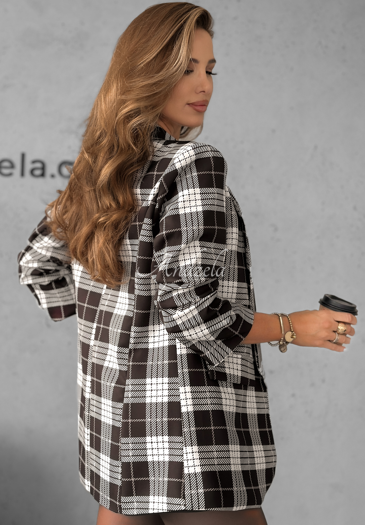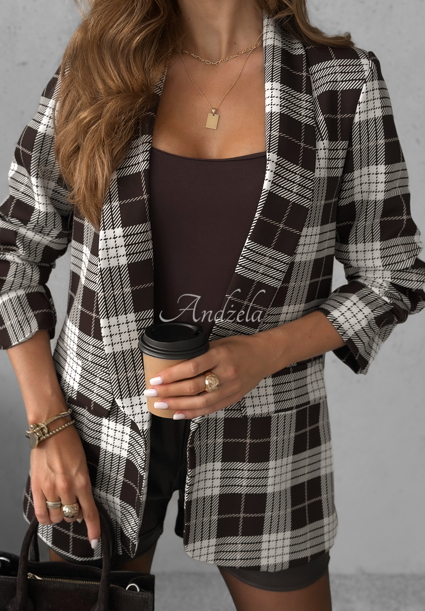 Sako z viskózy, které se vyznačuje módním károvaným vzorem. Nezapínací model s klasickým střihem a kratšími rukávy s nařasením. Má límeček a podšívku, vpředu se nacházejí imitace kapes.