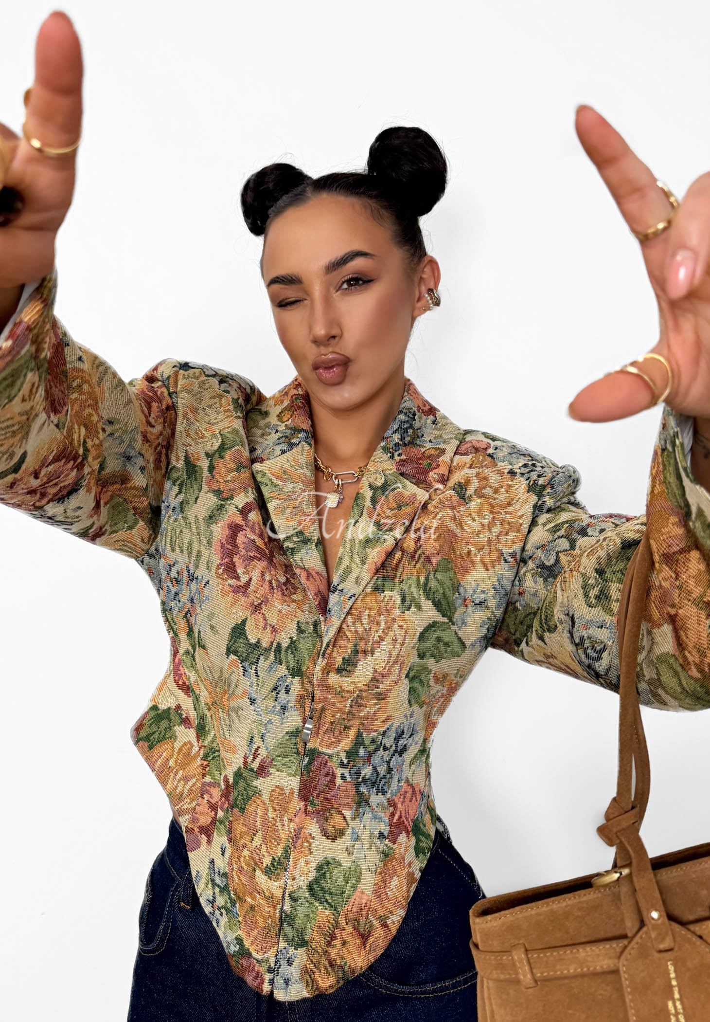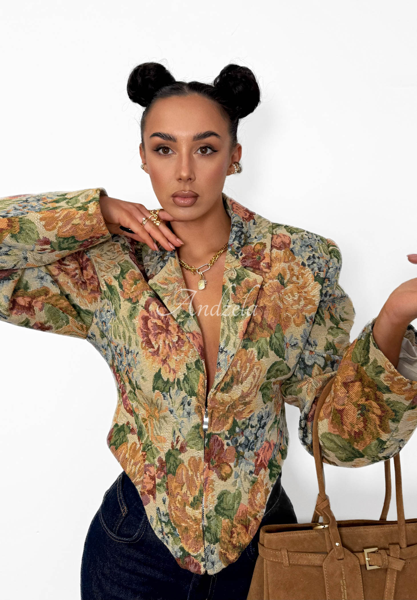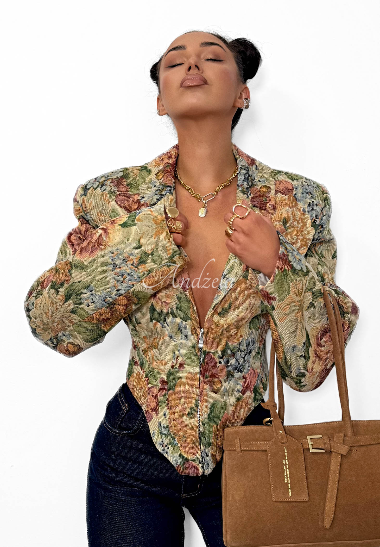 Krátké sako vyrobené z kvalitního bavlněného materiálu se žakárovou strukturou. Jde o model s korzetovým střihem a vycpávkami na ramenou, které dodávají postavě výrazný tvar. Další předností je módní květovaný vzor. Má límeček a zapínání na zip.