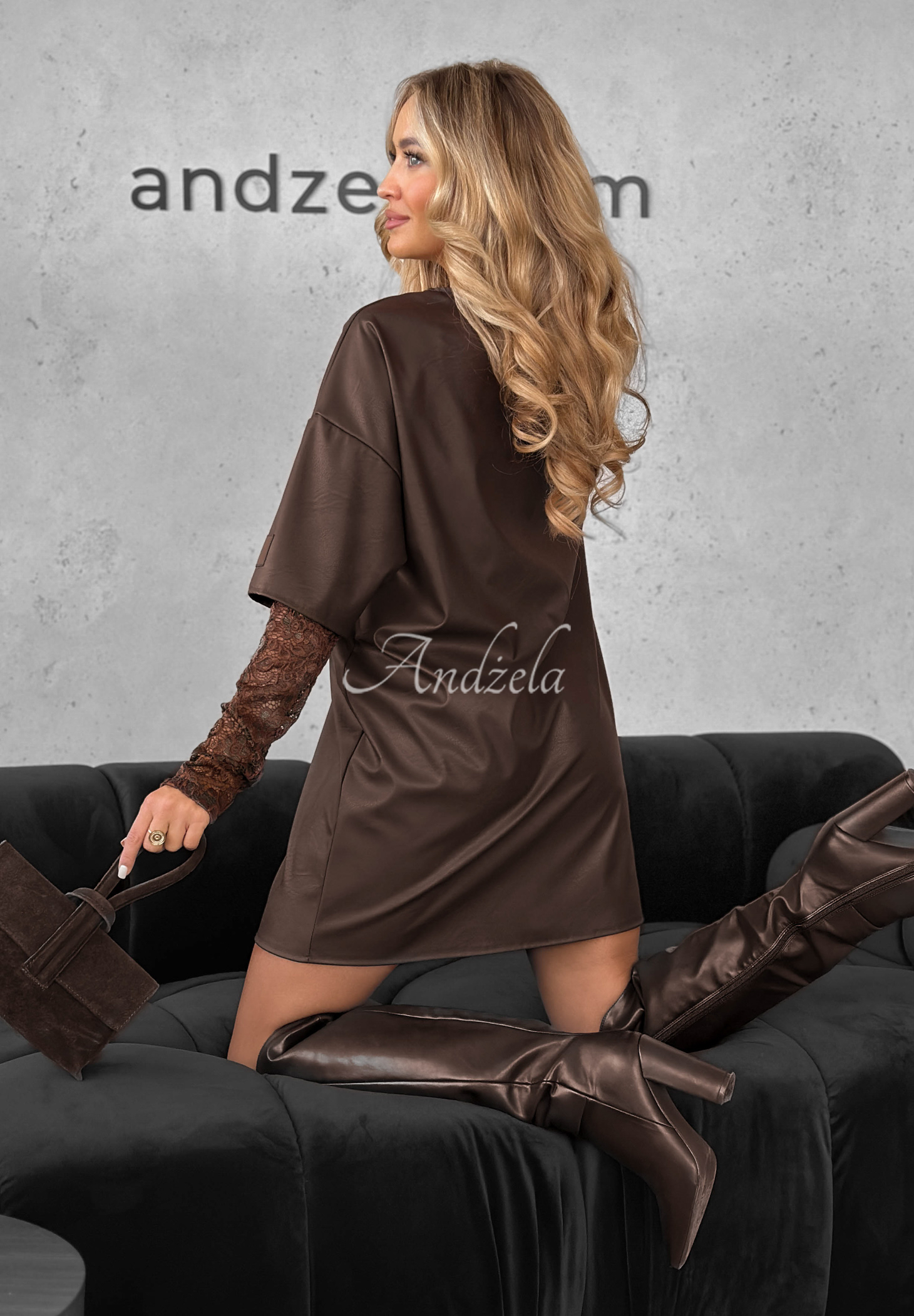 Kožené oversize šaty s krajkovými rukávy End Of That čokoládová