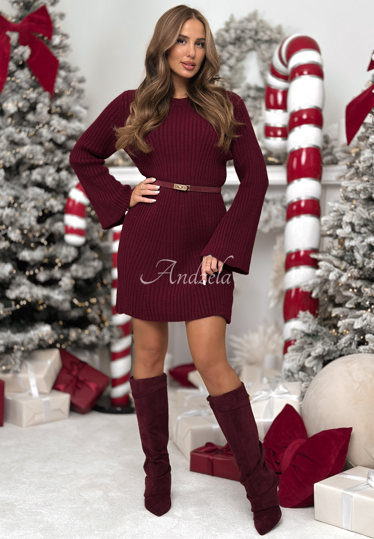 Svetrové šaty v mini délce, vyrobené z elastického materiálu. Tento model má zakulacený výstřih a dlouhé, rozšiřované rukávy.