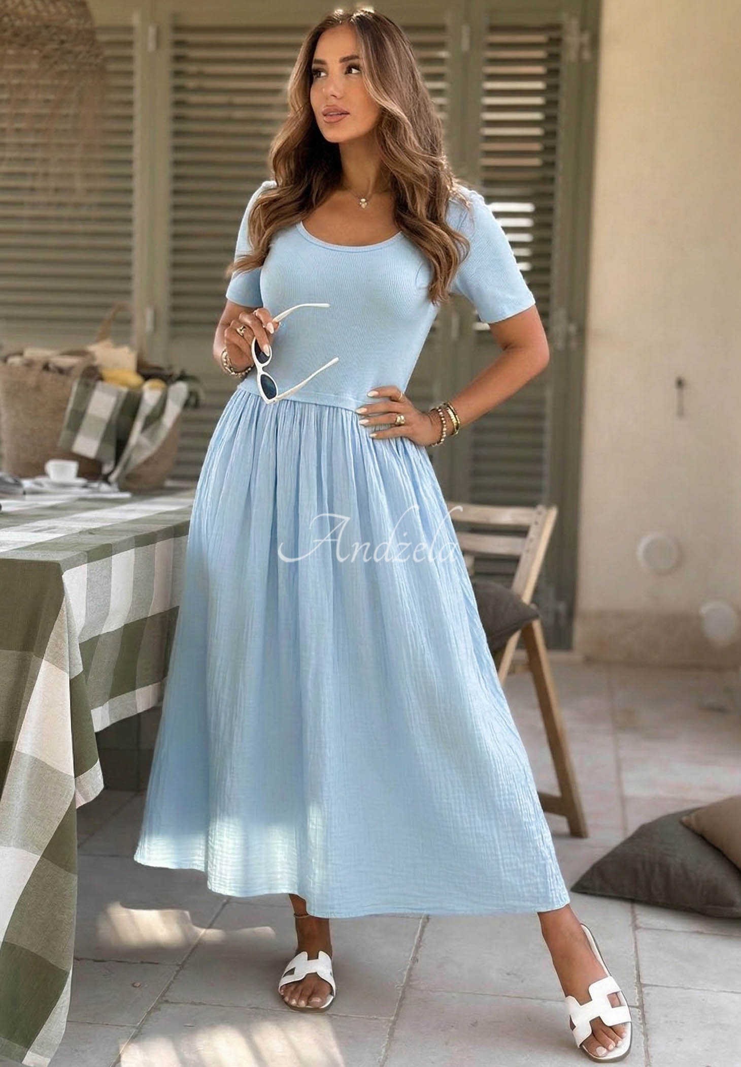Vzdušné šaty s žebrovaným, přiléhavým vrškem a rozšířenou sukní. Jde o model v midi délce se zaobleným výstřihem a krátkými rukávy. Pod nimi se nachází podšívka. Vyrobeny z bavlněného materiálu.