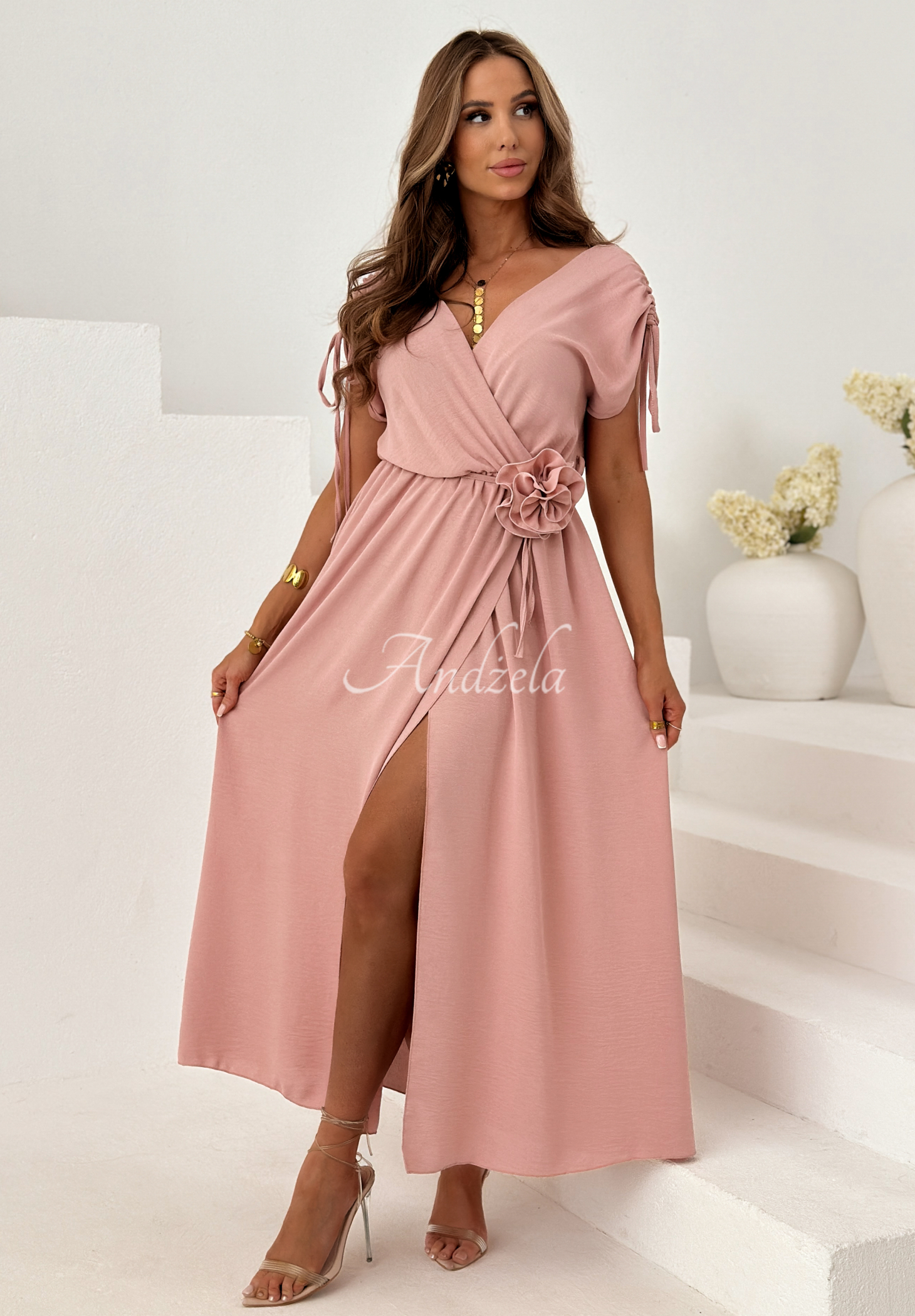 Viskózové šaty se stahováním a růží Dreamy Garden pudrová růžová
