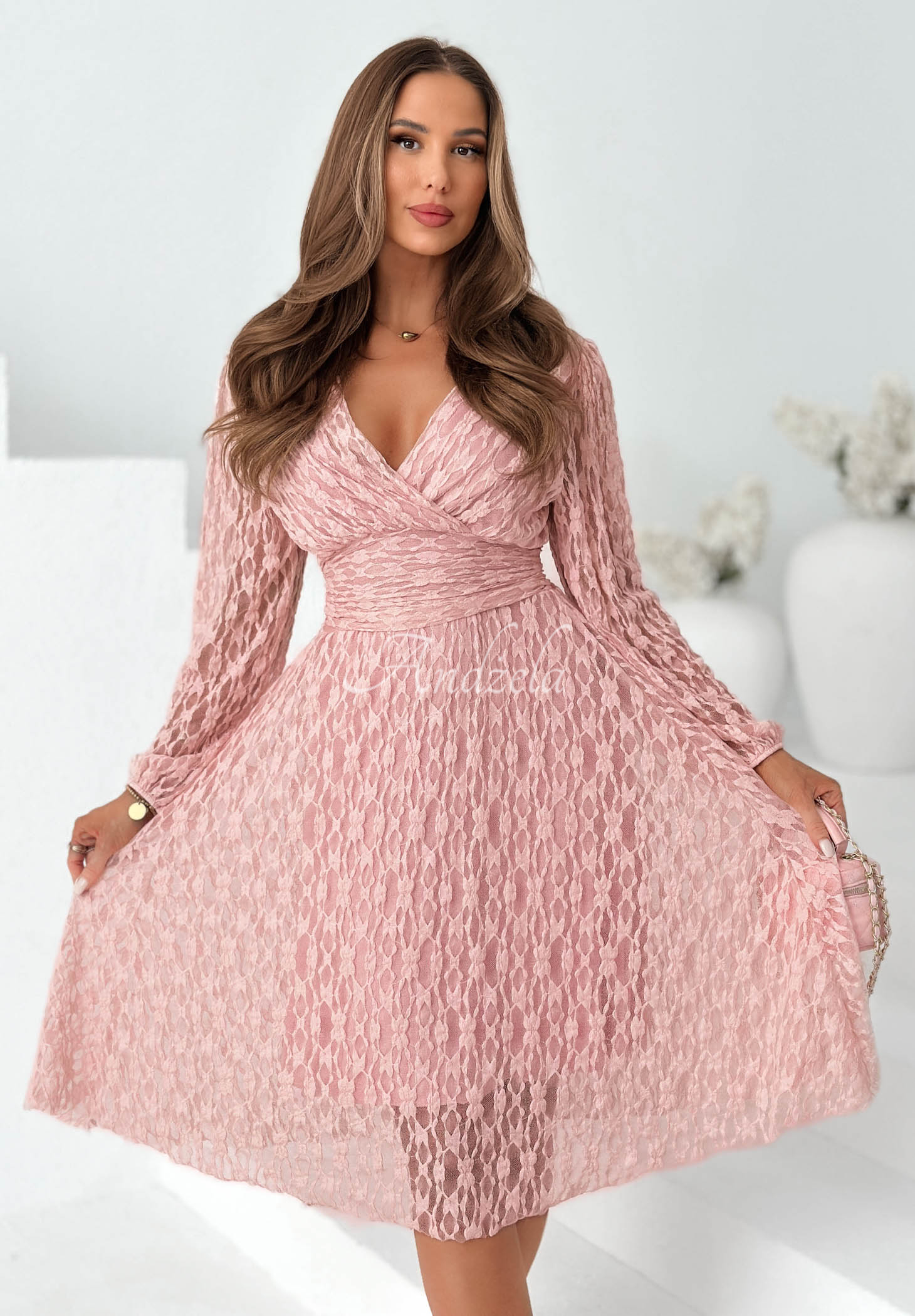 Krajkové šaty s překládaným výstřihem. Jedná se o model, který vyniká ozdobným páskem v pase a zavazováním vzadu. Má gumičku na zakončení rukávů.