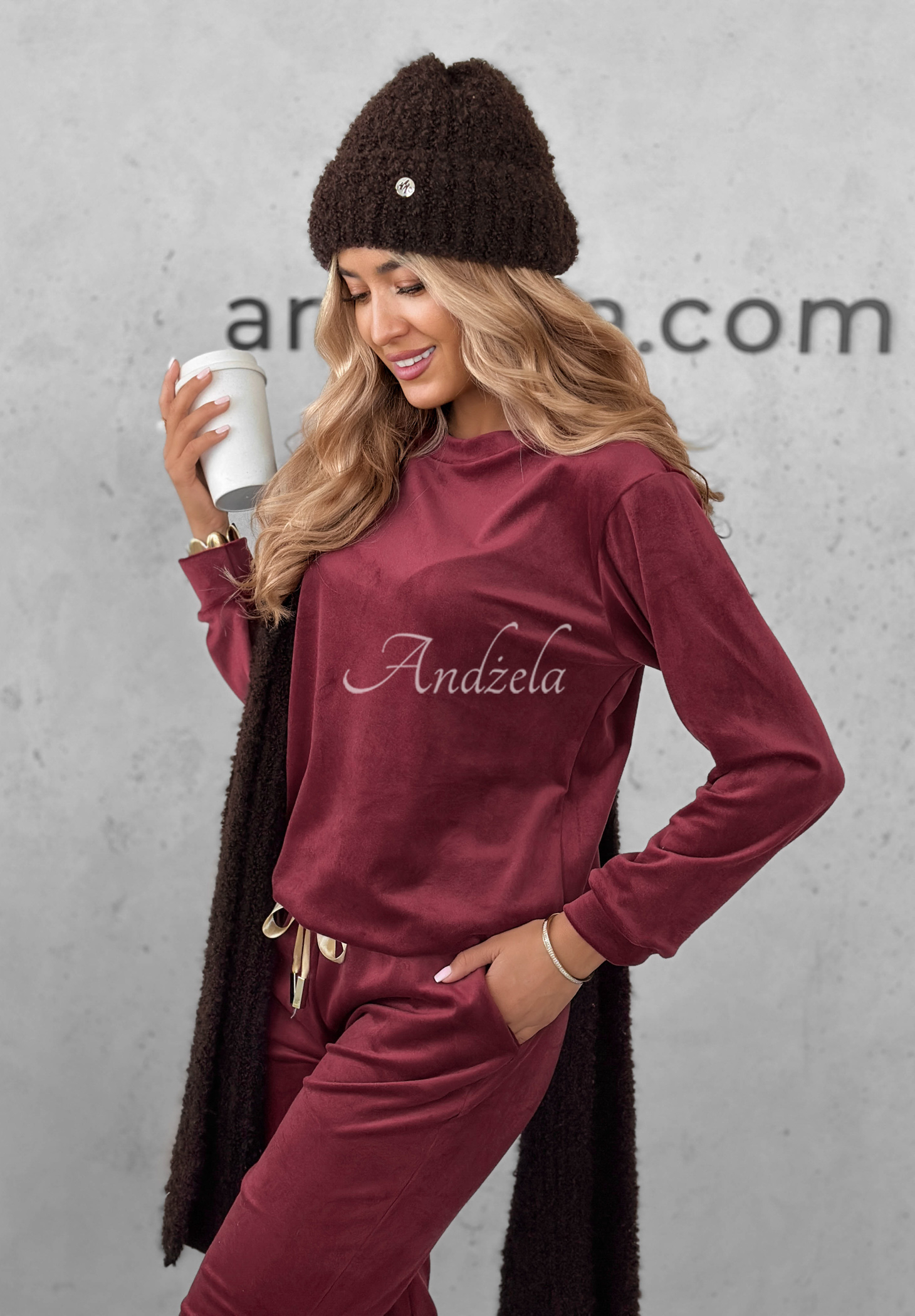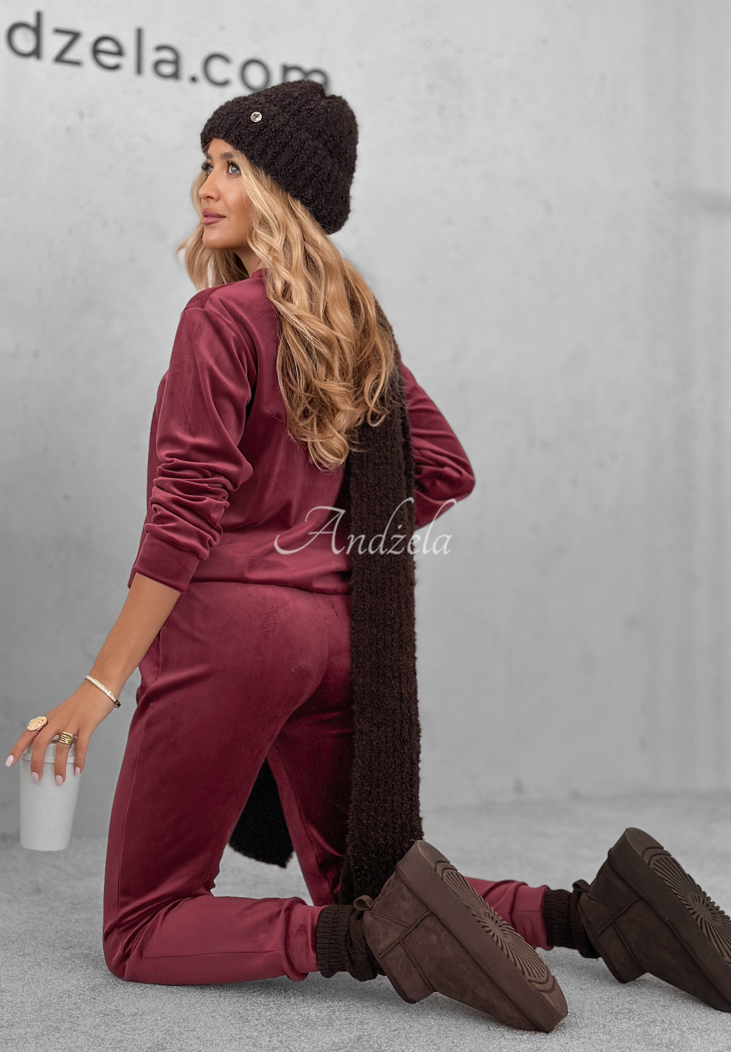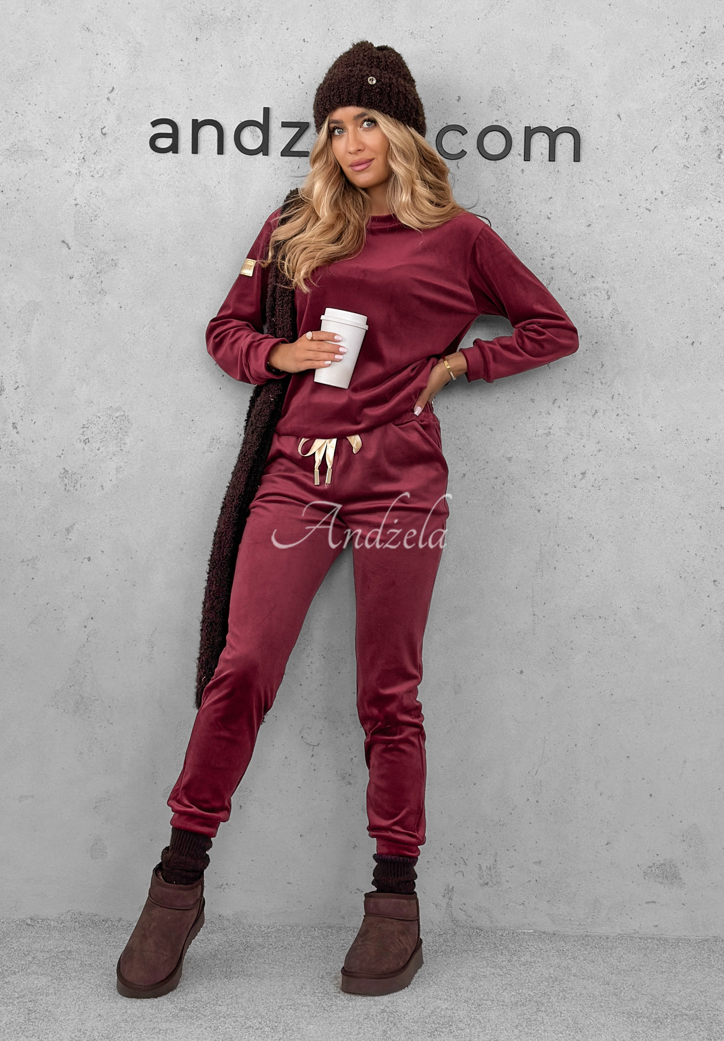 Velurová souprava vyrobená z hladkého, příjemného materiálu. Mikina má zakulacený výstřih a dlouhé rukávy, které jsou stejně jako spodní lem zakončené žebrovanými manžetami. Na jednom rukávu se nachází ozdobná nášivka. Kalhoty s vyšším pasem mají pružnou gumu v pase a dvě funkční kapsy.