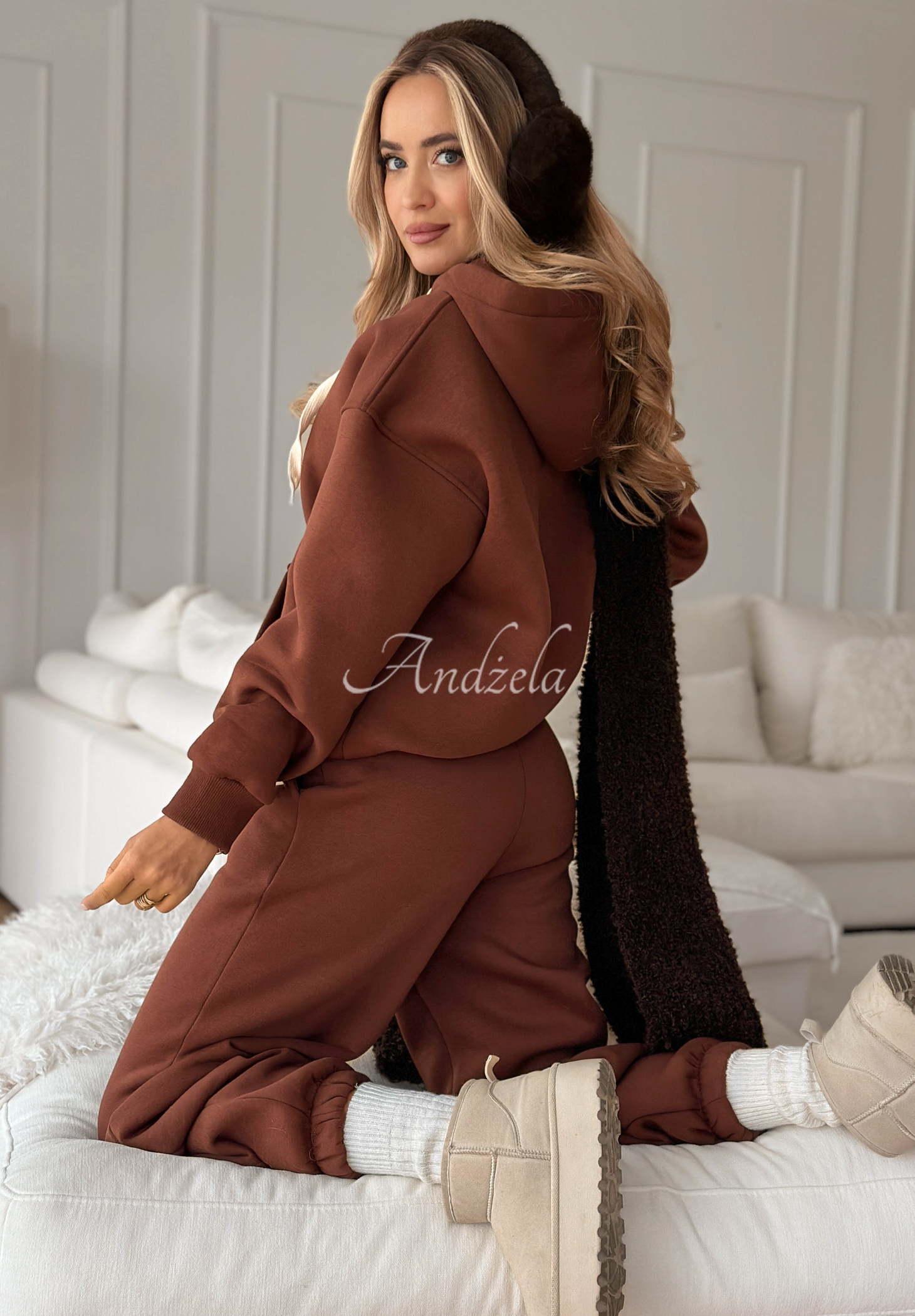 Zateplená tepláková souprava z bavlněného materiálu. Mikina v klasickém střihu s kapucí a klokaní kapsou. Kalhoty mají přední kapsy a elastickou gumu v pase, nohavice zakončené náplety.