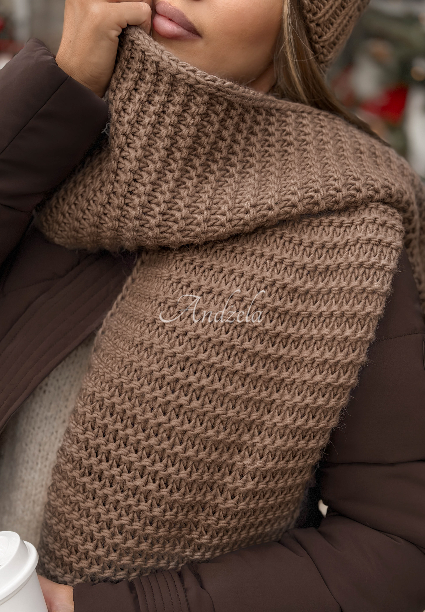 Souprava, která se skládá z čepice a šály, je vyrobena z příjemného, elastického materiálu s příměsí vlny. Čepice má bambuli, žebrování a stříbrný detail.