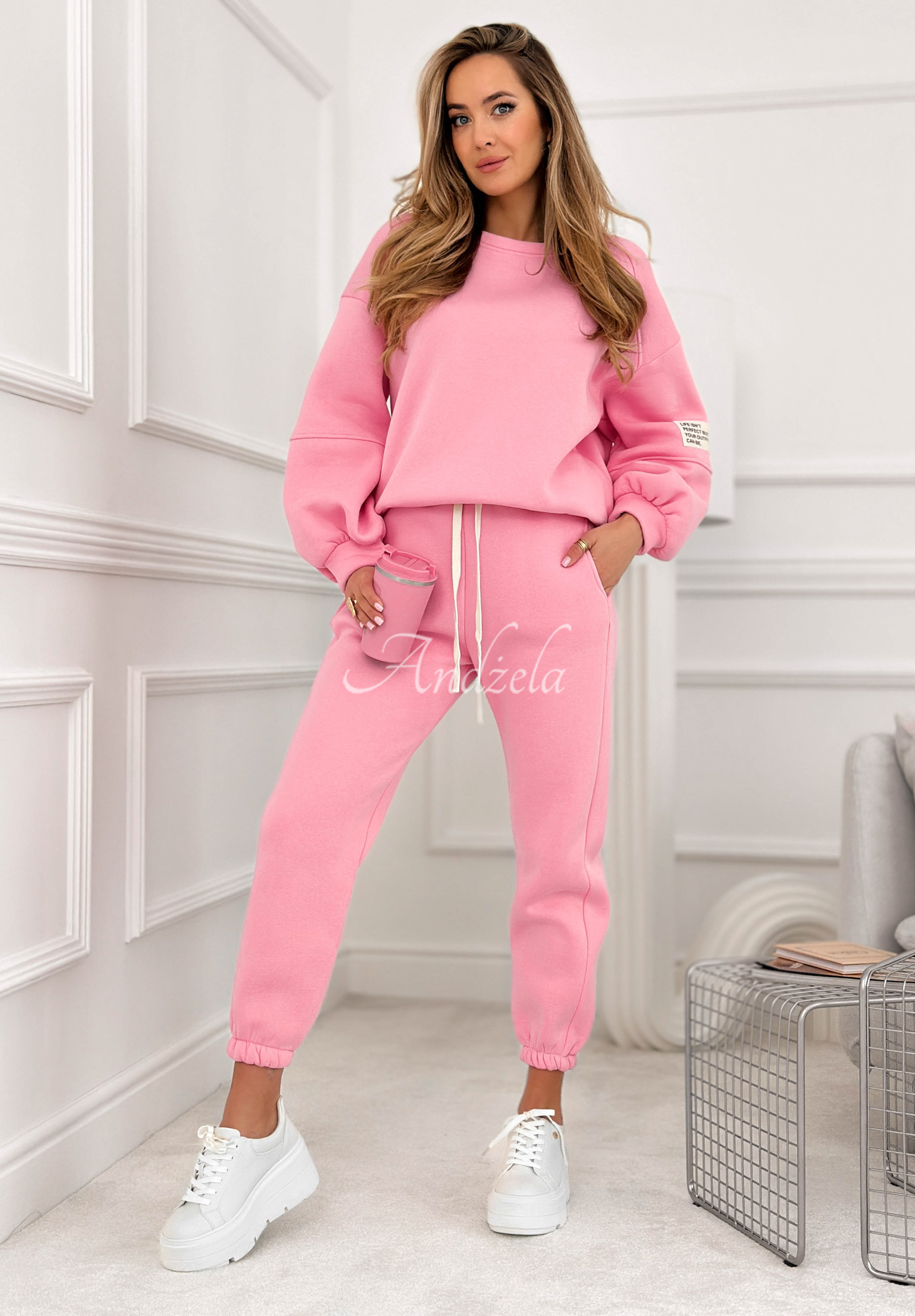 Zateplená tepláková souprava vyrobená z bavlněného materiálu. Mikina s kulatým výstřihem vyniká nášivkou na rukávu. Kalhoty se zvýšeným pasem mají elastickou gumu v pase a lemy na koncích nohavic.