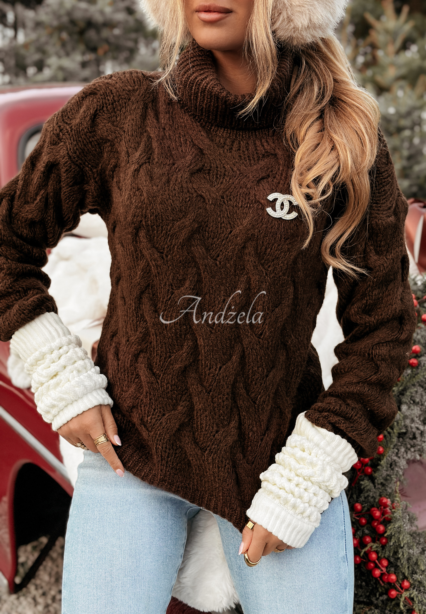 Ozdobně pletený svetr s rolákem Zea čokoládový