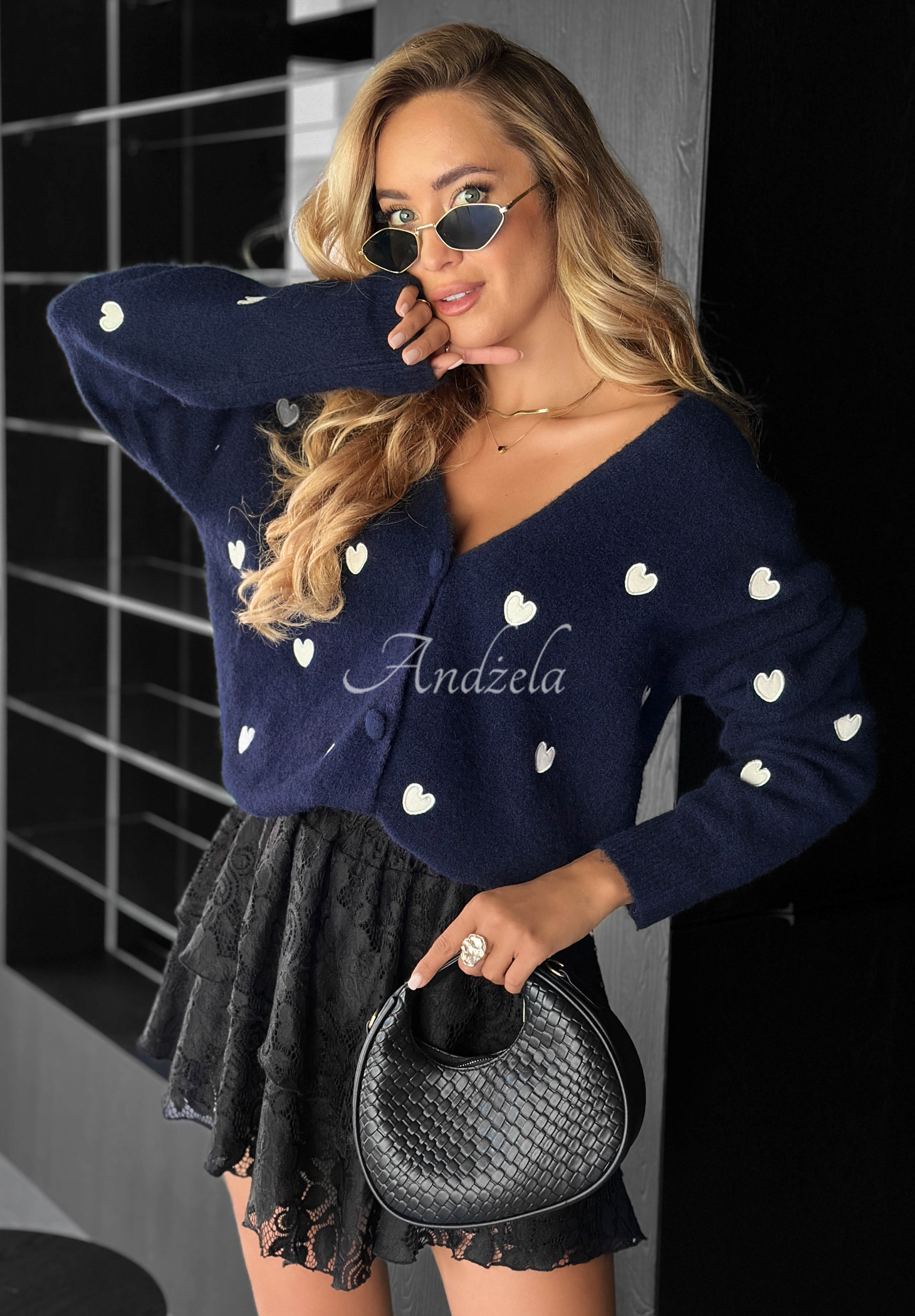 Krátký kardigan se srdíčky vyrobený z elastické tkaniny s příměsí vlny a viskózy. Zapínaný model na knoflíky má dlouhé rukávy a spodní lem zakončený žebrováním.