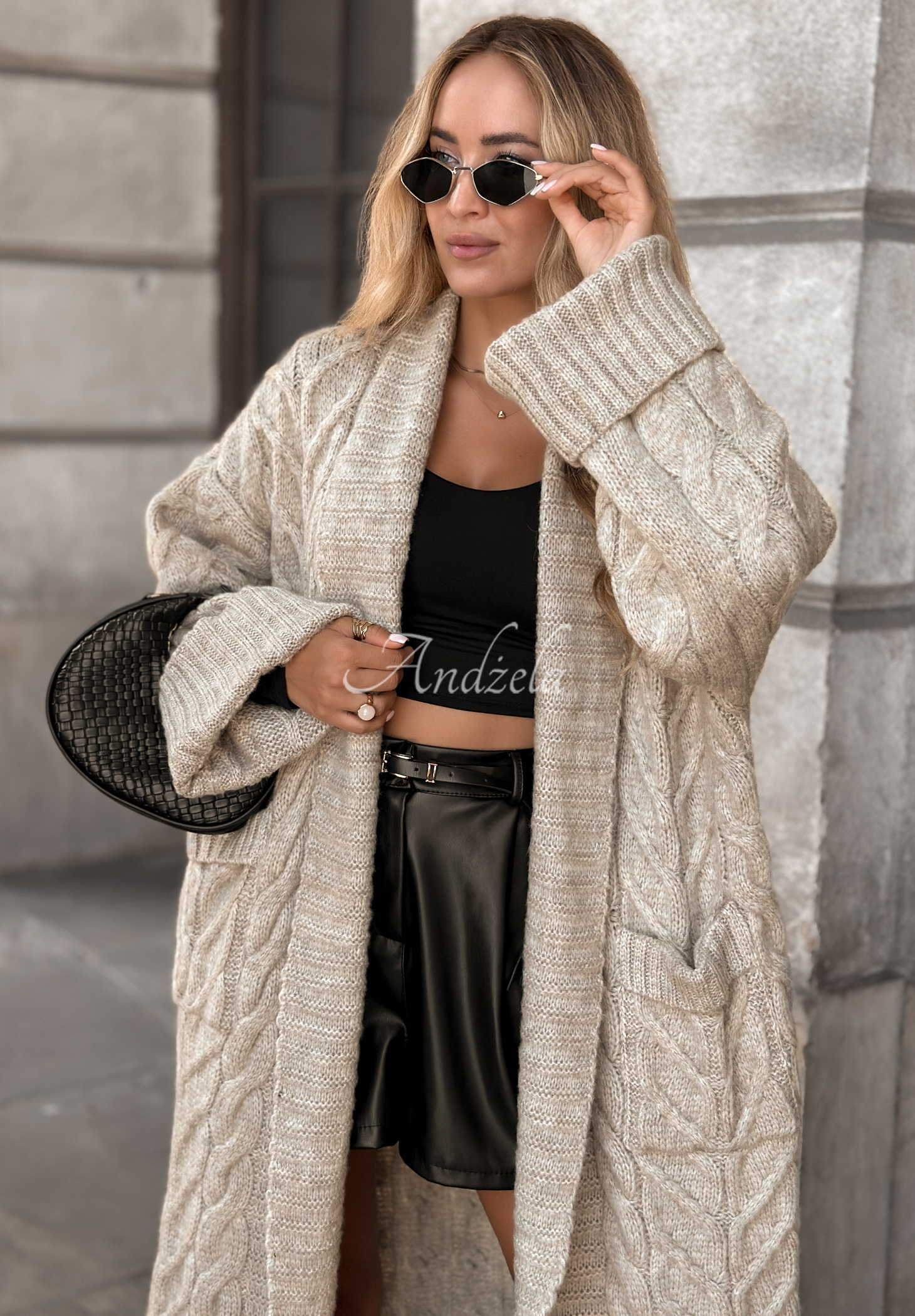 Dlouhý kardigan v oversize střihu je rozhodně nepostradatelným prvkem každého podzimně-zimního šatníku! Vyznačuje se ozdobným pleteným vzorem, má kapsy a žebrované lemy u rukávů.