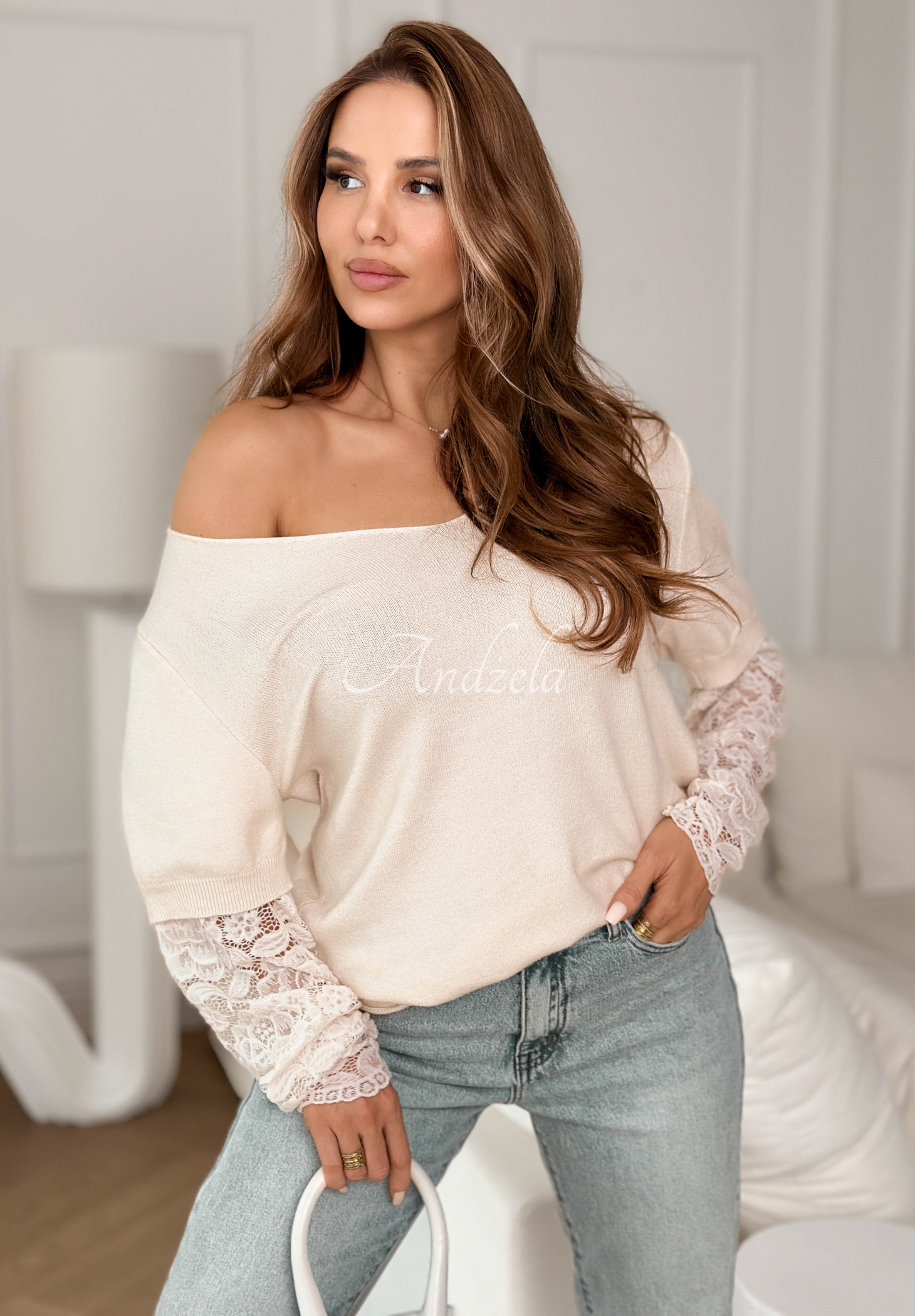 Lehký svetr vyrobený z měkkého a na dotek příjemného viskózového materiálu. Jedná se o model s ženským výstřihem do V. Vyniká krajkovými rukávy.
