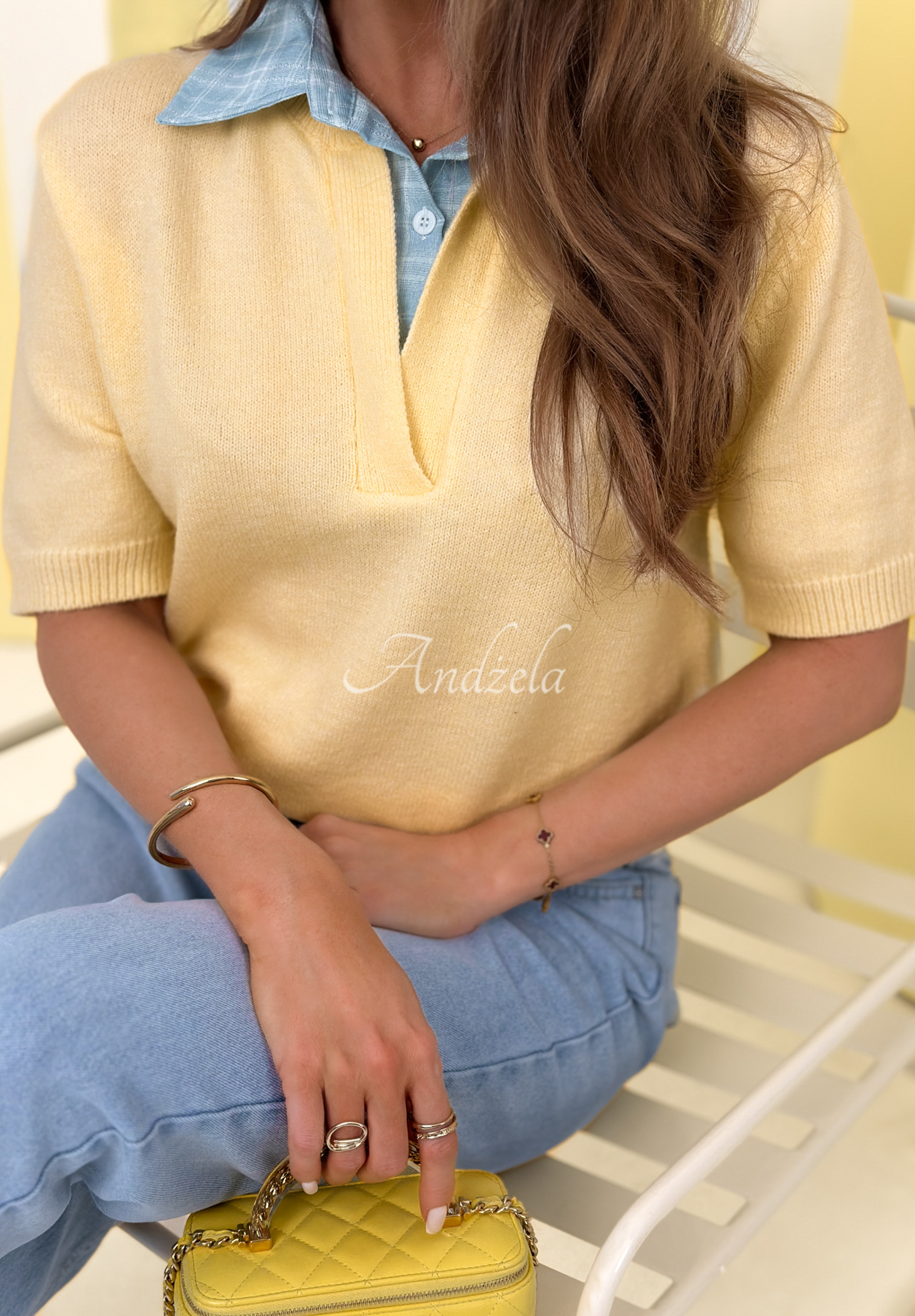Svetr vyrobený z viskózového materiálu. Model s výstřihem do V, jeho krátké rukávy i spodní lem jsou zakončeny náplety. Vyniká košilovou vsadkou s límečkem, zapínanou na knoflíky.