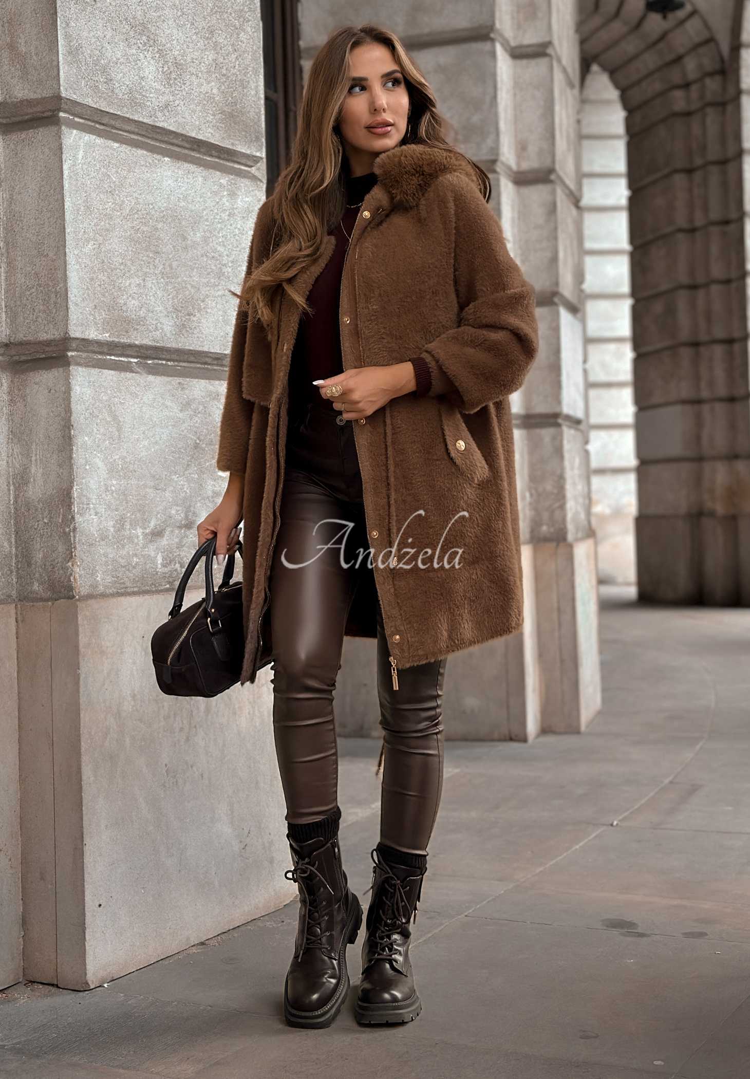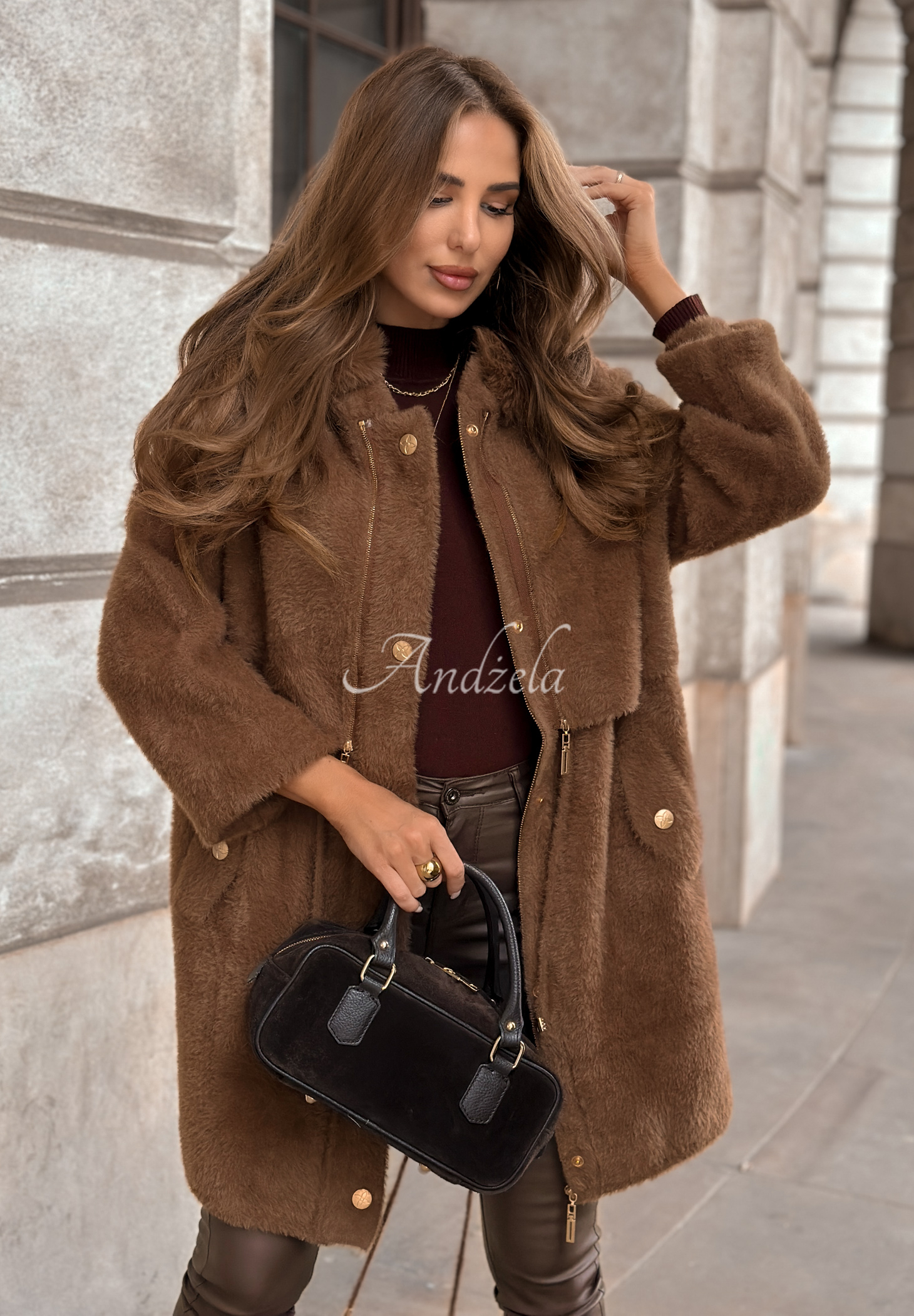 Dlouhý kabát vyrobený z vysoce kvalitních materiálů s příměsí vlny, viskózy a angory. Model v oversize střihu s neodepínatelnou kapucí, u které se nachází měkké kožíšek. Zapíná se na zip a druky, v pase a dole má nastavitelné stahování.