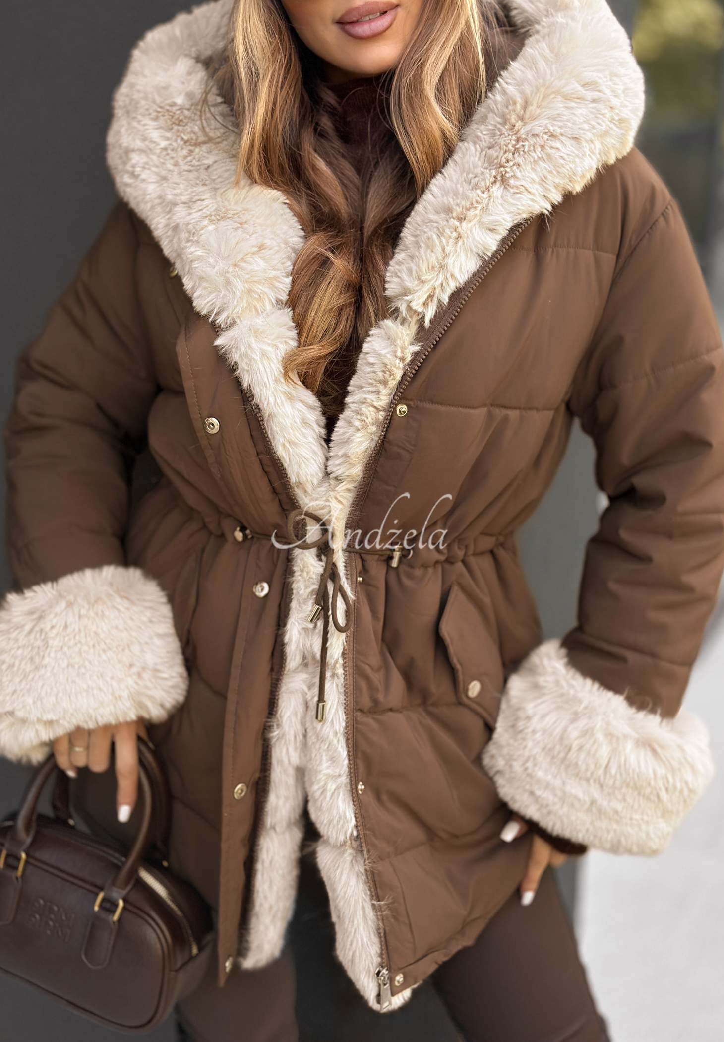 Teplá bunda s měkkým, efektním kožíškem, vyplněná syntetickým peřím. Prošívaný model s kapucí a zapínáním na zip a druky. Má funkční zapínací kapsy a stahování v pase. Celkový vzhled doplňují stříbrné detaily.