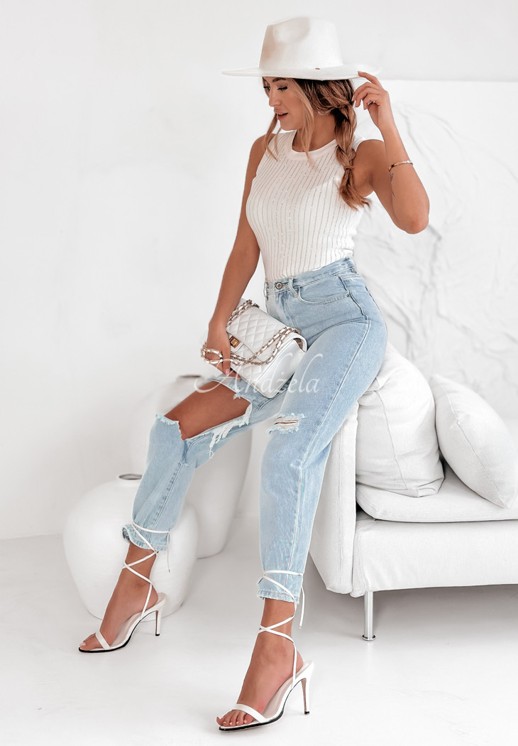 Top z viskózy je skvělým základem pro looky pro různé příležitosti. Vyniká ozdobnou aplikací na přední straně z drobných stříbrných krystalů. Jedná se o žebrovaný model s kulatým výstřihem, který perfektně sedí na postavě.