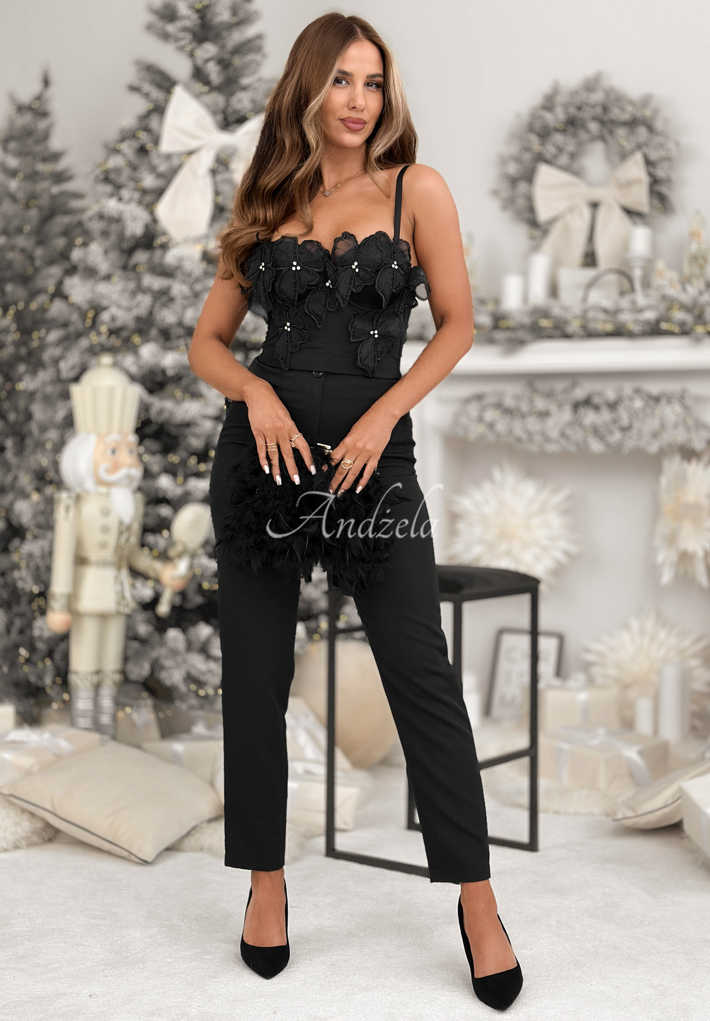 Krátký top je ideální volbou na speciální příležitosti. Vyniká našitými ozdobnými květy. Model má nastavitelná ramínka a vyztužené košíčky. Zapíná se vzadu na několik háčků.