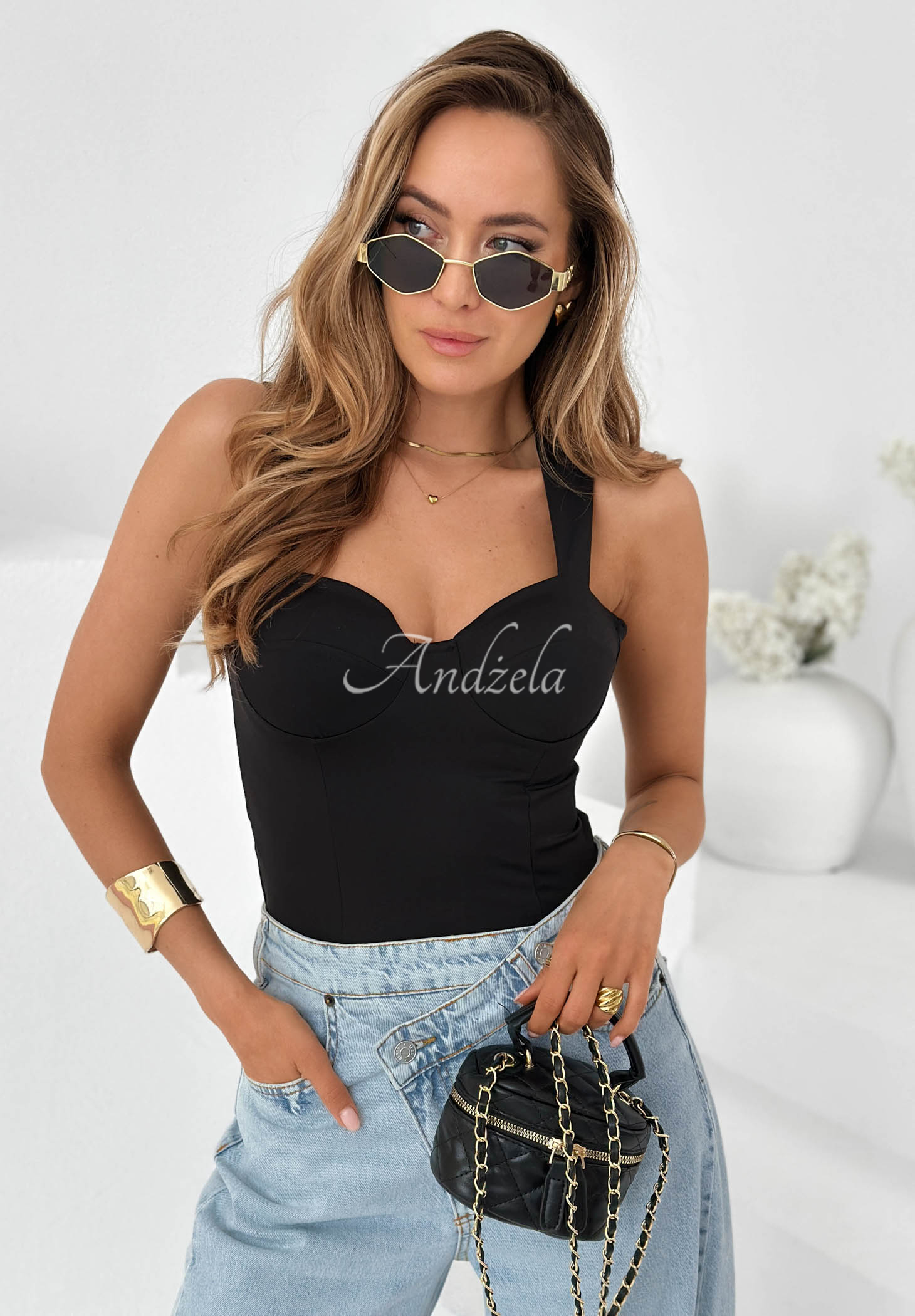 Krátký top s vázaným chokerem, vyrobený z elastického materiálu. Jedná se o model přiléhavého střihu s vyztuženými košíčky.