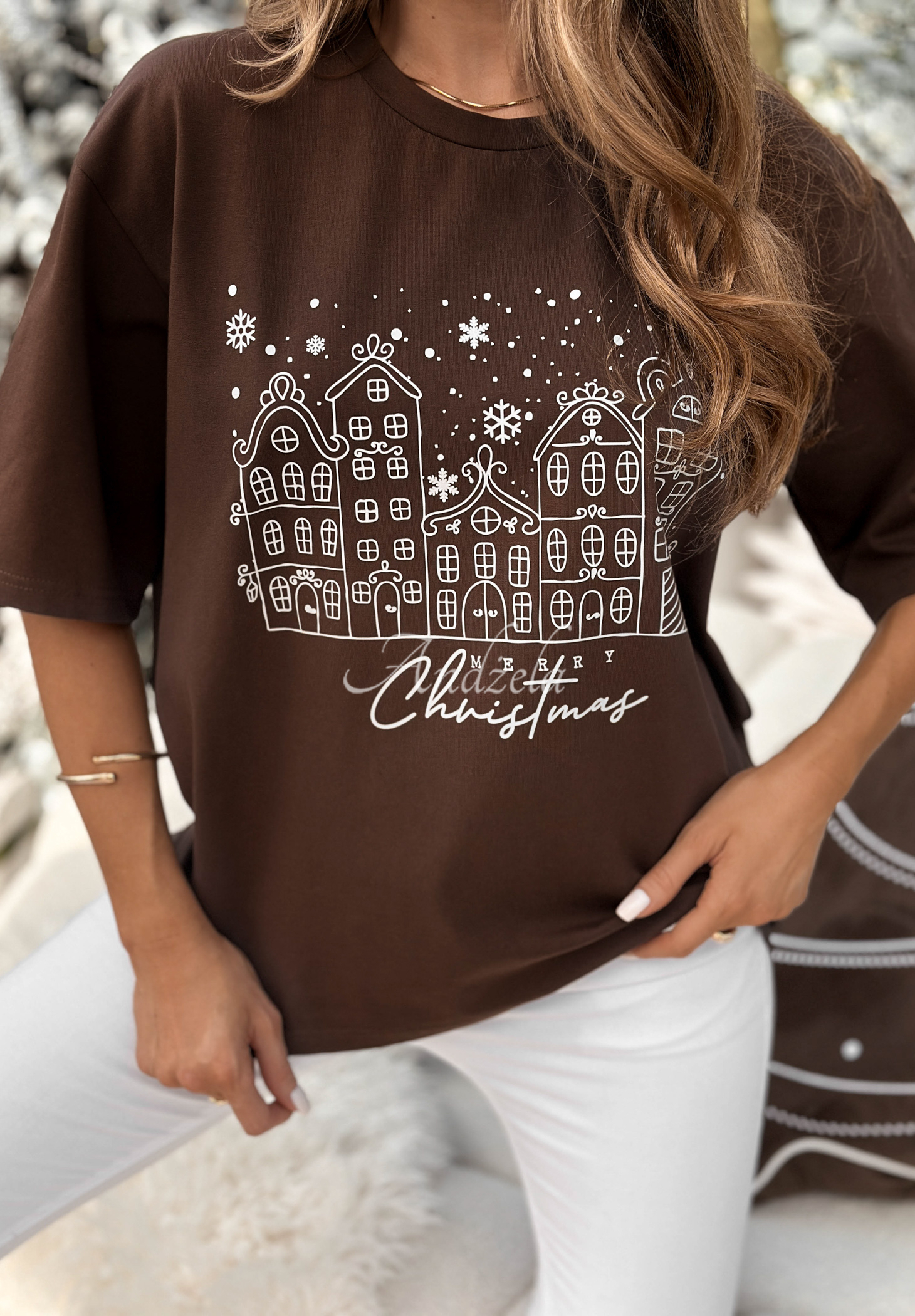 Vánoční tričko s potiskem Snowy Christmas čokoládový