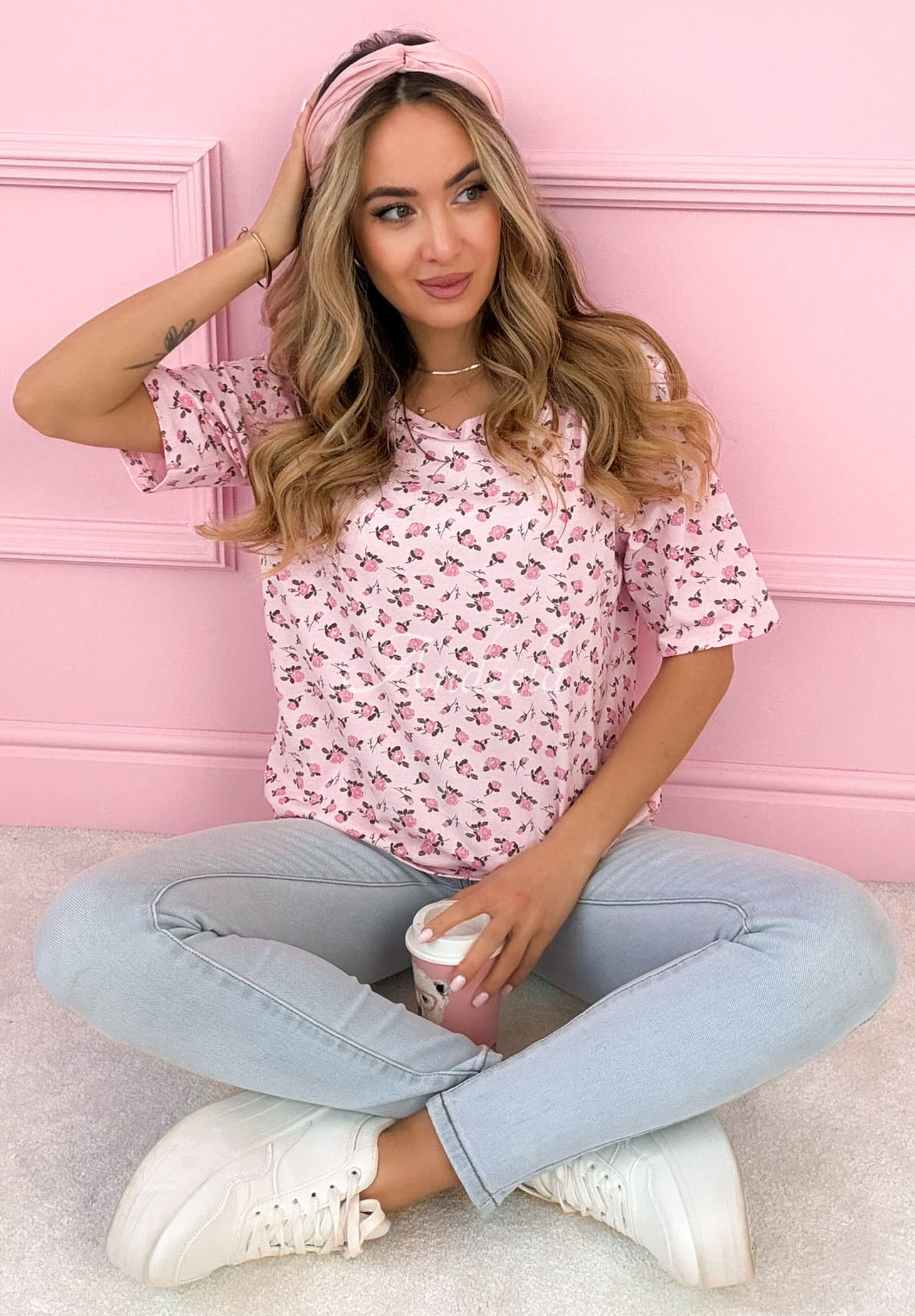 Tričko s růžičkami, vyrobené z elastické bavlněné tkaniny. Jde o model klasického střihu s kulatým výstřihem a krátkými rukávy.